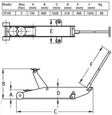 The Compac 3T-HC High Lift Trolley Jack has a capacity of 3000 kg and features a fully welded chassis and lifting arm. In addition, the hydraulics are fitted with an overload valve. This prevents the jack from being used beyond it's rated capacity.